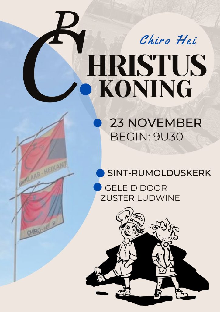 Op zondag 23 november 2025 viert de Chiro naar jaarlijkse gewoonte het feest van Christus Koning. We verwachten uw zoon of dochter om 9u op de jongenschiro en we verwachten u om 9u30 in de kerk van Berlaar-Heikant voor een echte chiroviering met typische chiroliedjes en creatieve tekstjes! Nadien gaan de leden en leiding terug naar de Chiro waar er voor hen een warme maaltijd wacht, gevolgd door een hele dag vol spel en plezier. Om 17u moeten we jammer genoeg afscheid nemen van de mini’s, de maxi’s en de rakwi’s. De oudste afdelingen zetten hun dag nog even verder; na een heerlijk avondmaal spelen ze nog een avondspel en om 20u eindigt ook hun dag. Het uur van de oudsten zal afhankelijk zijn van het spel, dus dit kan iets later worden.